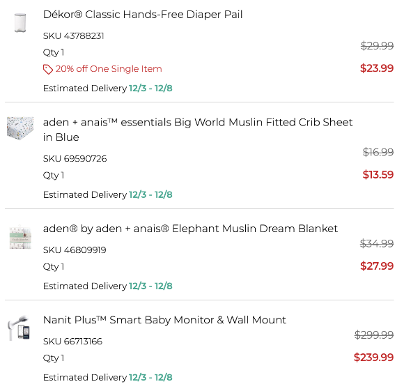 그리고 본격 블랙프라이데이 쇼핑 모드에 돌입하기 전, 친구들에게 임밍아웃을 했다. 우리 나이가 있는지라 대부분의 친구들에게는 이미 아이가 있었기 때문에, 득템의 바람이 가득한 임밍아웃이기도 했다 ㅎㅎ. 당시 Nordstorm에서 Nuna Mixx stroller가 크게 세일하길래 계속 예의 주시하고 있었는데, 남편 친구 중 한 명이 안 쓰는 유모차가 있다고 해서 일단 보류했다. 이것저것 물려받을 것들이 생기다 보니, 결국 내가 이번에 구매한 것들은 Nanit의 baby monitor, 기저귀 쓰레기통, aden+anais의 크립 매트 시트와 아기 이불! Buy buy baby에서 세일중인데다가, $300을 쓰면 $100 크레딧을 주는 프로모션을 진행 중이어서, 딱 $300 조금 넘게 주문했다.